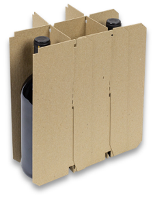 The Fiber-A consists of one long strip, perforated twice and intersected with a short strip creating a 6-cell partition which can be fixed to wall of container to prevent fall-out. It is shipped assembled to increase productivity and decrease labor costs when compared to similar corrugated products. This design is suitable for higher speed lines using automatic erection/inserting equipment.